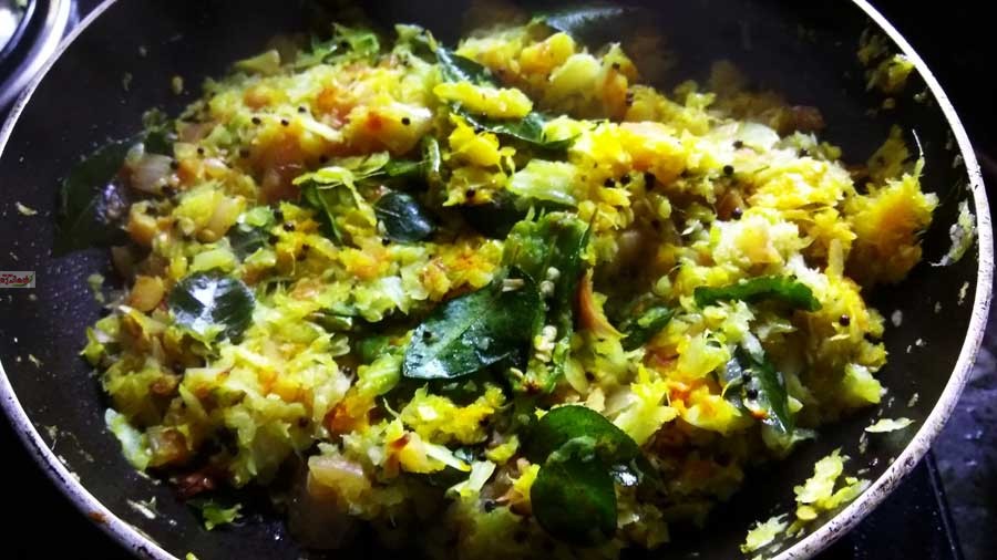 Saute until onion turns it color slightly. Then add chopped cabage into it. Add salt and turmeric powder. Stir it well and cook for 5 to 10 minutes. Then add cooked chana dal into it and mix well. cook for 3 to 5 minutes.