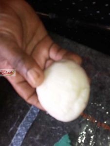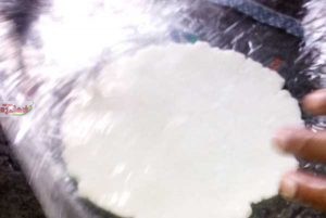 and place in a banana leaf or in a aluminium foil/ plastic cover, spread little oil on it. Roll out the ball by pressing with hand. Or you can place another leaf/ aluminium foil on the dough